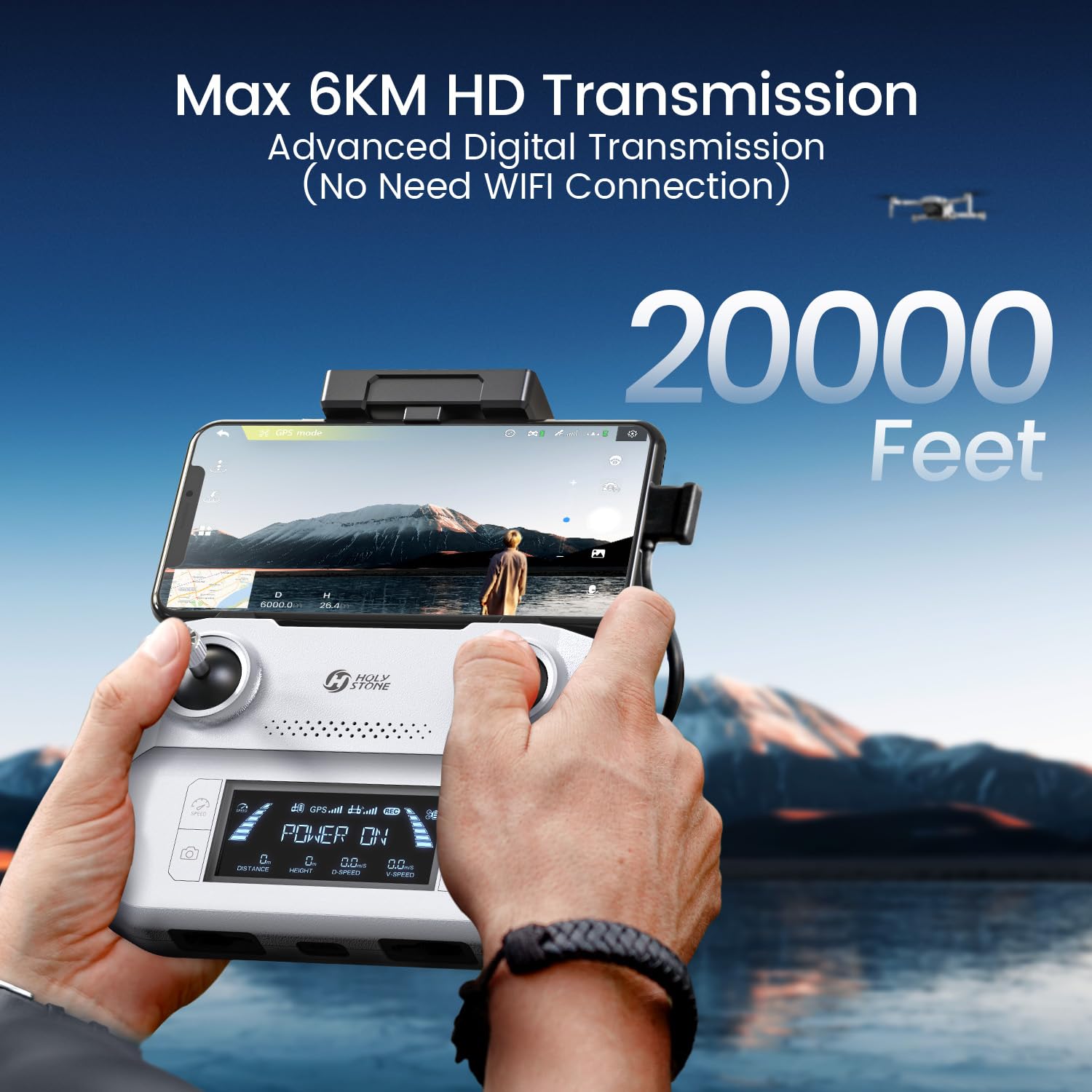 - 20,000FT Transmission with Low-Latency FPV: Unlike typical drones that rely solely on WiFi, the Holy Stone HS360D Drones with camera for adults 4K features a wired connection between the remote controller and your mobile device—dramatically reducing video latency. Enjoy smoother live-feed visuals, easier flight control, and uninterrupted 4K FPV transmission up to 20,000 feet (6KM)