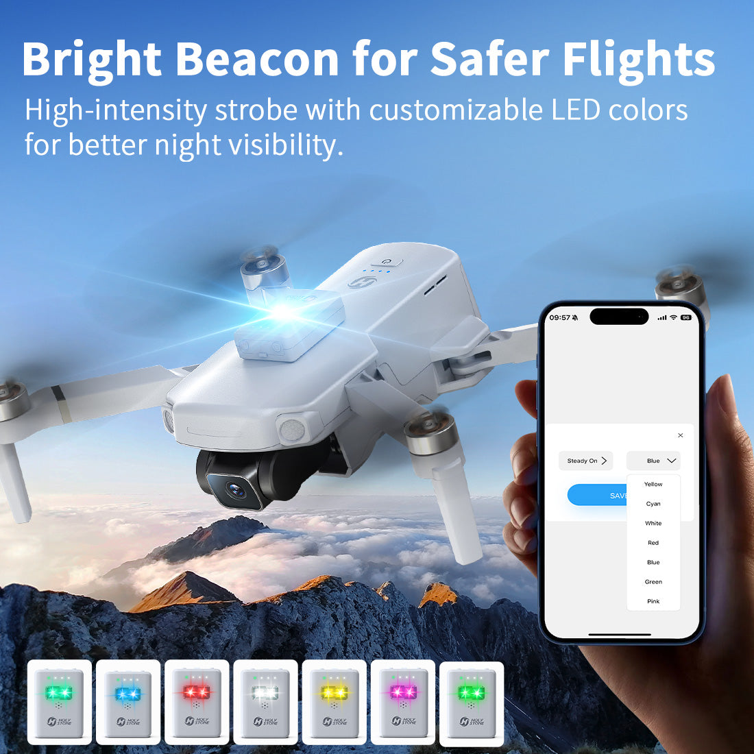 - 【Customizable Strobe Lighting】HSRID02 is equipped with bright strobe lights offering green flash and red‑green‑white alternating modes. You can also set your own pattern through the app, improving visibility and make night flights easier and safer.